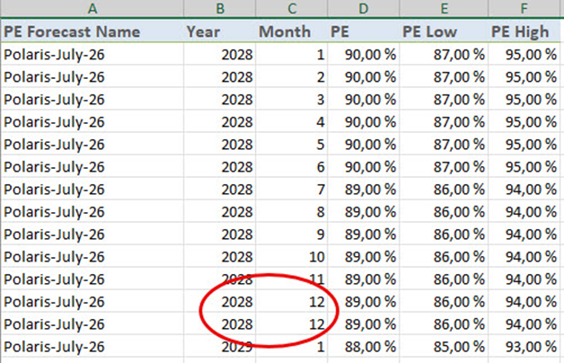 The problem with your input data is related to the number of months. For example for year 2028 in your list, you had accidentally added the month nr. 12 twice. To resolve this, simply remove the extra line, and your import should work swiftly.